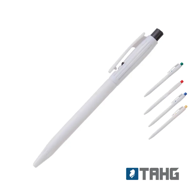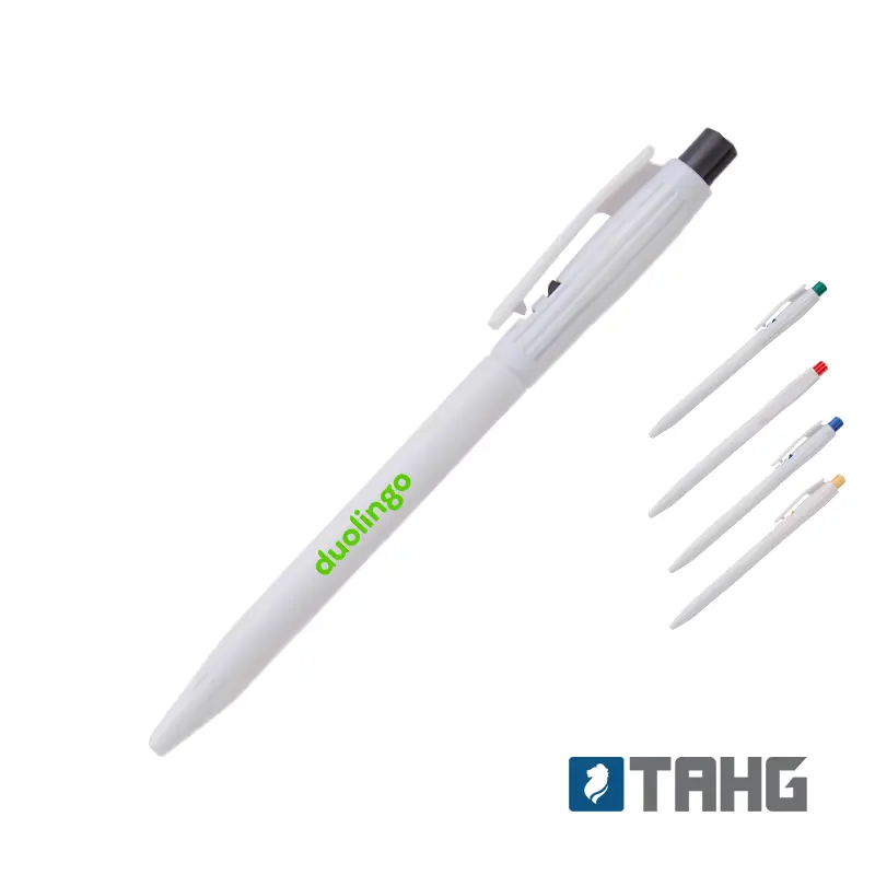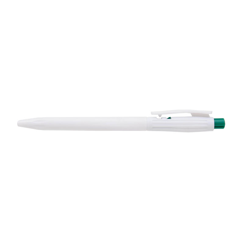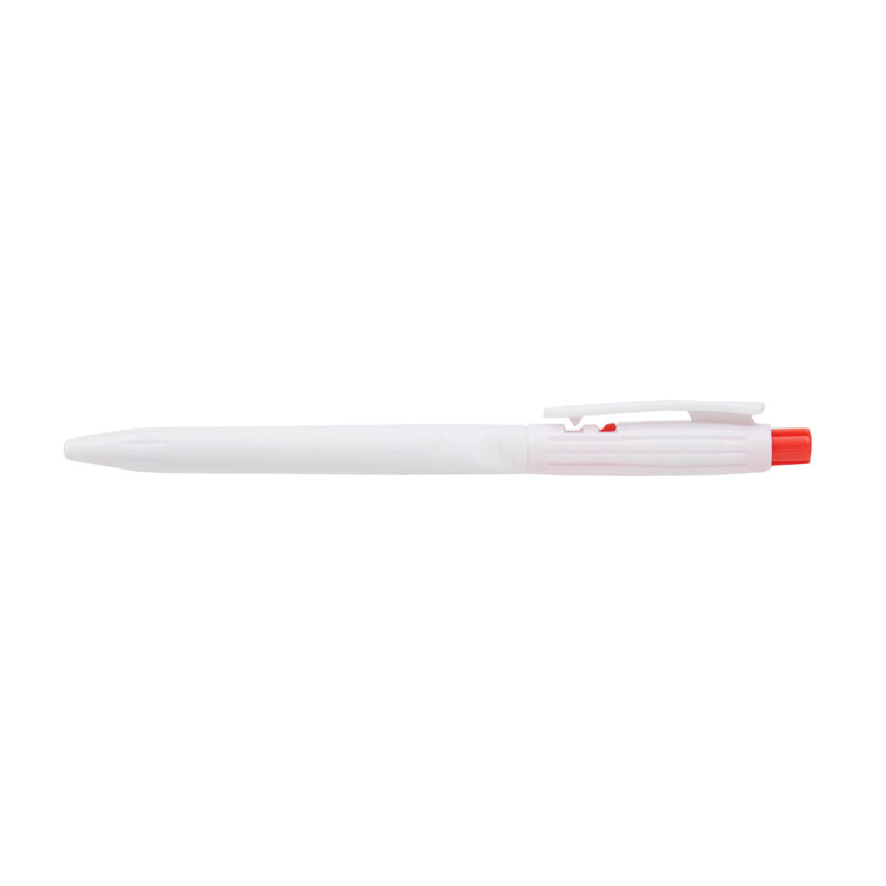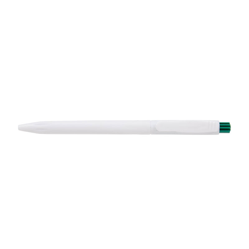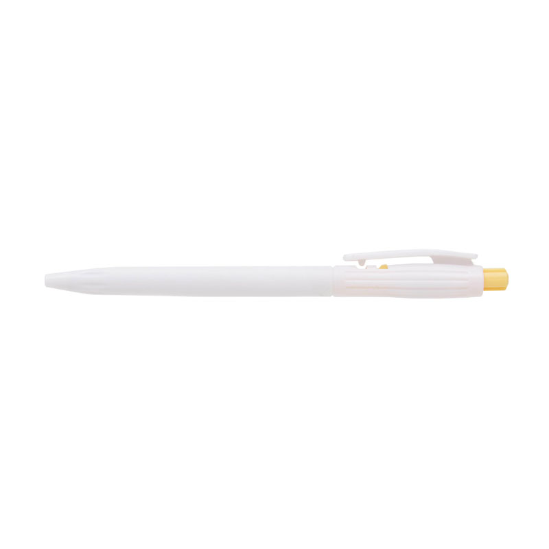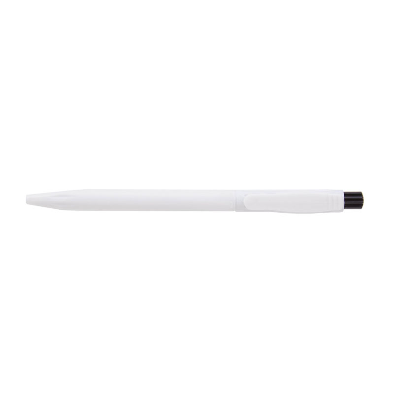 Lápiz confeccionado en ABS, de cuerpo de color blanco y clip en color. Apertura con pulsador. Tinta Azul