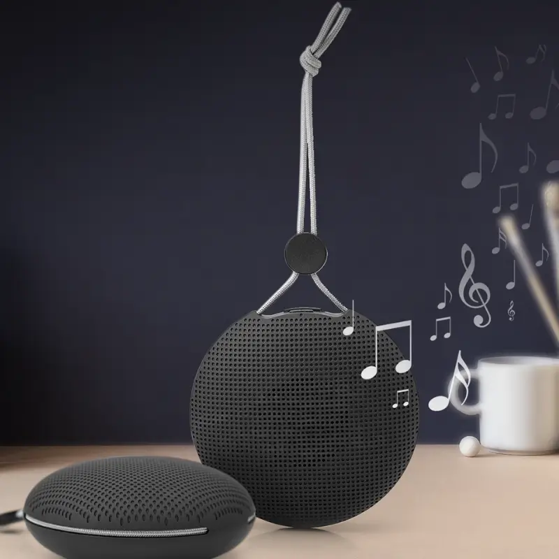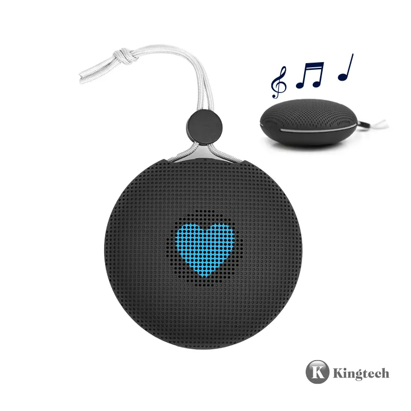 Parlante circular portátil con tecnología bluetooth y micrófono manos libres. Realizado en ABS, con correa para colgarlo y facilitar su transporte. | Batería de 400mAh | Potencia del parlante: 3W | Frecuencia: 60Hz-16KHz | Conexión5v/300mA | Peso: 159g | Medidas Diámetro 98* altura45mm | Kingtech.