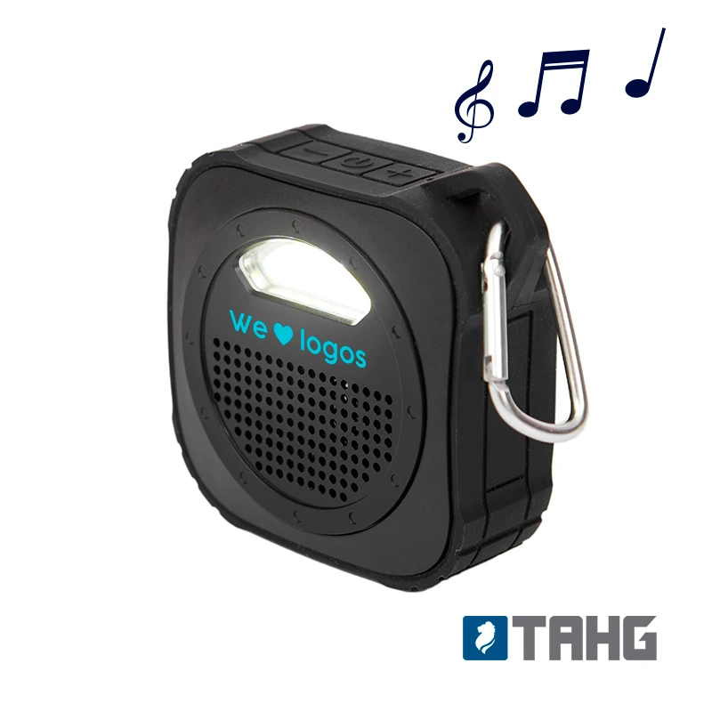 Parlante Bluetooth, con luz de 5V. Cuenta con gancho para transportarlo. Está realizado en ABS y silicona. Batería: 600mah. Medidas: 9 x 9 x 3,3 cm.